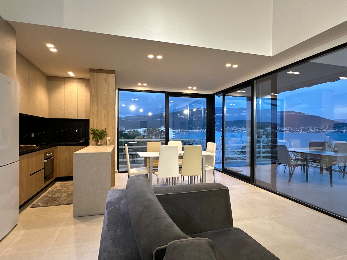 Apartamento soleado y panorámico que ofrece las vistas más espectaculares de la bahía de Vlora. Puedes disfrutar de los impresionantes azules y verdes del mar y sentir la comodidad y la paz en la zona más codiciada. La residencia donde se encuentra la casa es de nueva construcción, el área total del apartamento es de 120 m2 y tiene dos balcones con vistas al mar. Un balcón pertenece a la sala de estar y a la cocina, mientras que el otro a la habitación matrimonial. El apartamento tiene otra habitación amueblada con 2 camas individuales.