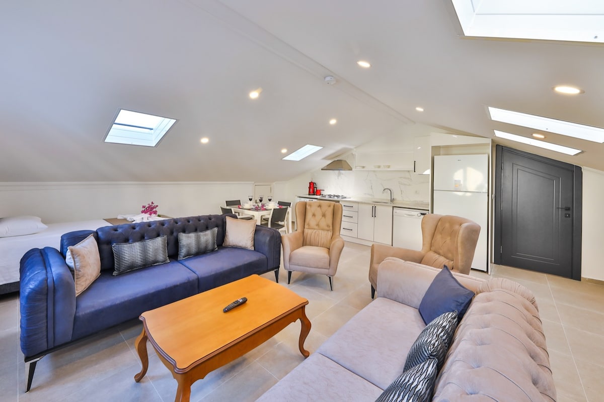Puedes pasar unas buenas vacaciones con tu familia en este loft, que está a 5 km del centro de Kalkan. Esta casa, que se encuentra a pocos pasos del mercado, también tiene una gran terraza.