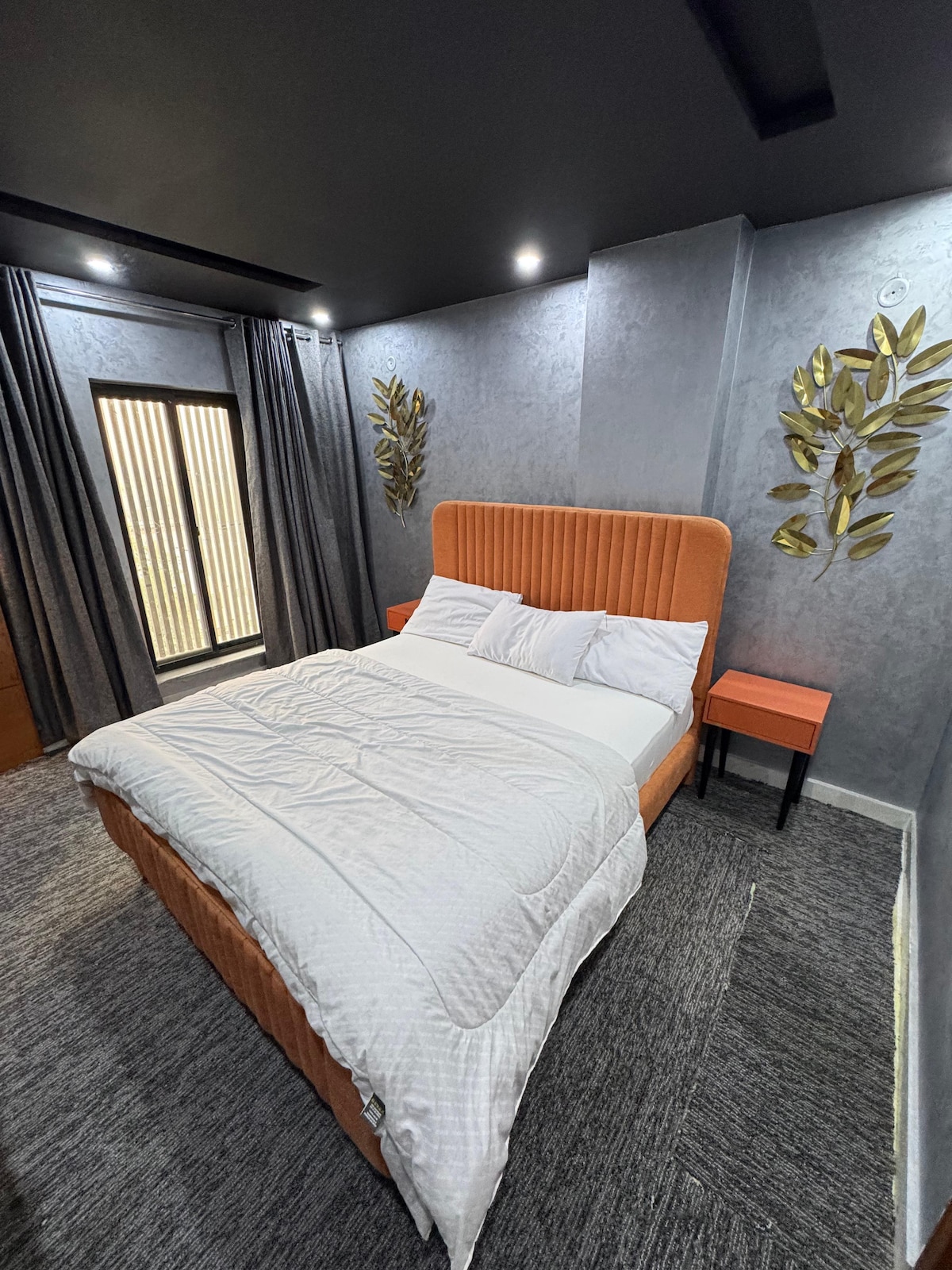 Experience a designer crafted apartment built for comfort and style. Located in a peaceful, secure area, it features a private terrace with beautiful views, a plush bed, 55 inch TV with Netflix and elegant lighting. The fully equipped kitchen includes a German stove, big fridge to store your snacks , kettle and LG washer. A unique monarch modern theme, mural wallpaper and premium décor create a perfect space to relax and enjoy your stay