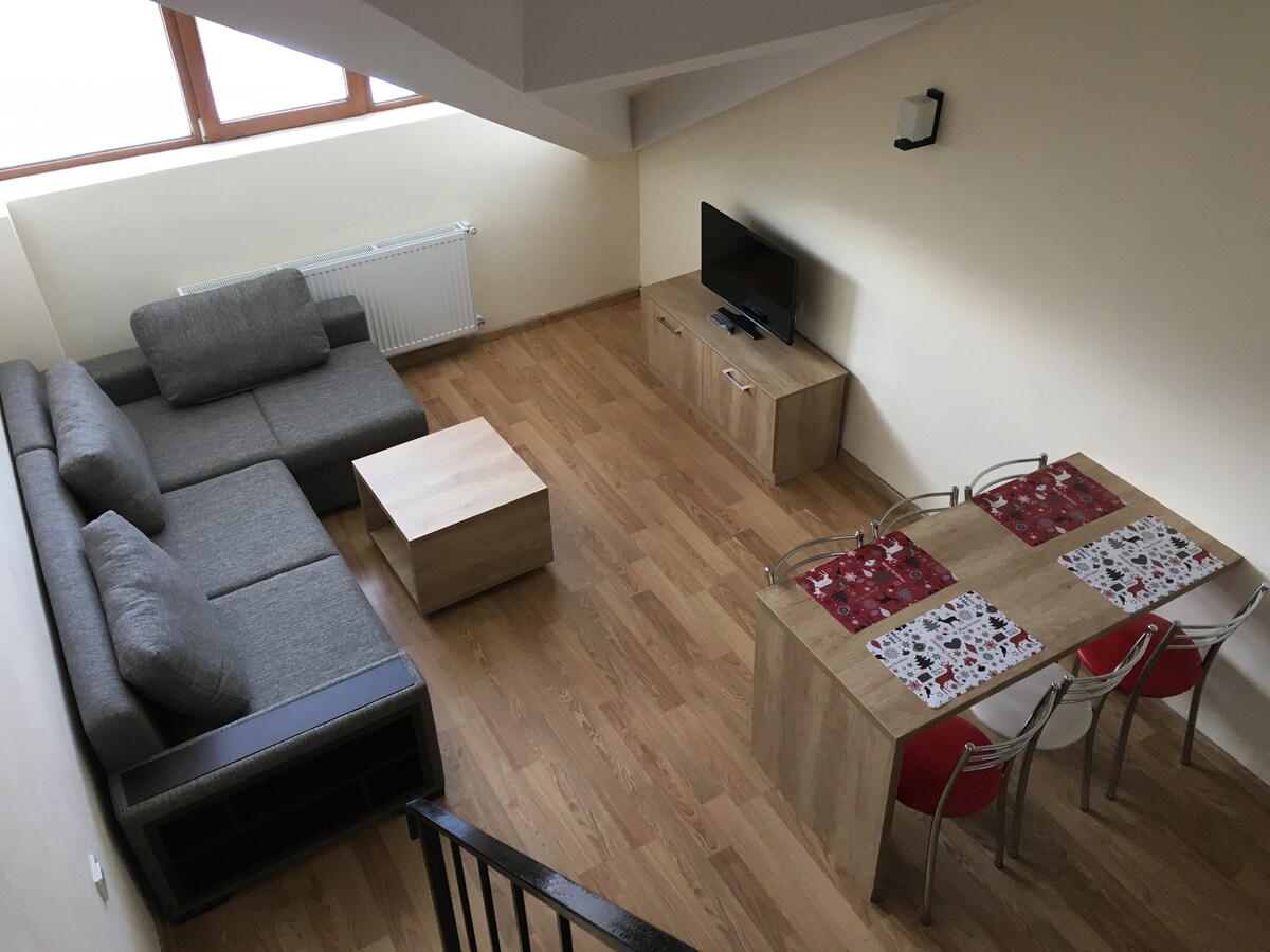 Ski duplex 100m² at 200m from gondola in New Gudauri. Walk home and relax by fireplace facing Caucasus peaks. SPACE 2 levels, 2 private bedrooms, sleeps 6, 3 bathrooms • Wood fireplace • Equipped kitchen • Panoramic views • Balcony • WiFi • Smart TV LAYOUT Level 1: Open studio, sofa bed 160x200, kitchen, fireplace, bathroom with tub Level 2: Br1 bed 160x200, Br2 two beds 90x200, 2 private bathrooms SKI Gondola 200m (4-min walk) • Ski lockers basement • Rental shop 50m