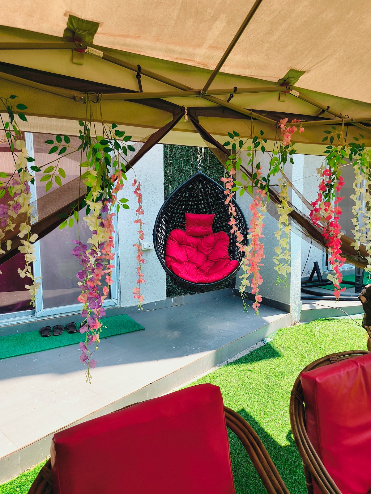 Estudio de lujo de estilo boho con jacuzzi y jardín. Una escapada tranquila. Totalmente equipado con wifi, cine en casa JBL 2.1, sistema de música BT y TV LED Full HD. Un elegante baño con artículos de aseo. Despensa con suministros de té/café, agua RO, microondas, placa de inducción, nevera y tostadora s/w. Jardín vallado para niños. Cena en el jardín con buen tiempo. El jacuzzi tiene agua caliente que se puede usar en cualquier momento. Servicios comunes en el lugar como piscina, sala de juegos, gimnasio, miniteatro, ciclismo y restaurante.
