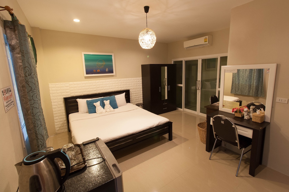 Tipo de habitación: Habitación con aire acondicionado con una cama tamaño king, tamaño de habitación de 45 metros cuadrados. *No incluye desayuno para este anuncio. Ofrecemos alojamiento semanal diario. No se permite cocinar en la habitación. Nuestro centro vacacional también sirve como puerta de entrada a varios recorridos de aventura, escalada en roca de clase mundial, buceo de esnórquel, así como una puerta de entrada a la mundialmente famosa isla Phi Phi y más. Habitación con aire acondicionado Habitación privada Baño privado Estacionamiento gratuito Wi-Fi gratis