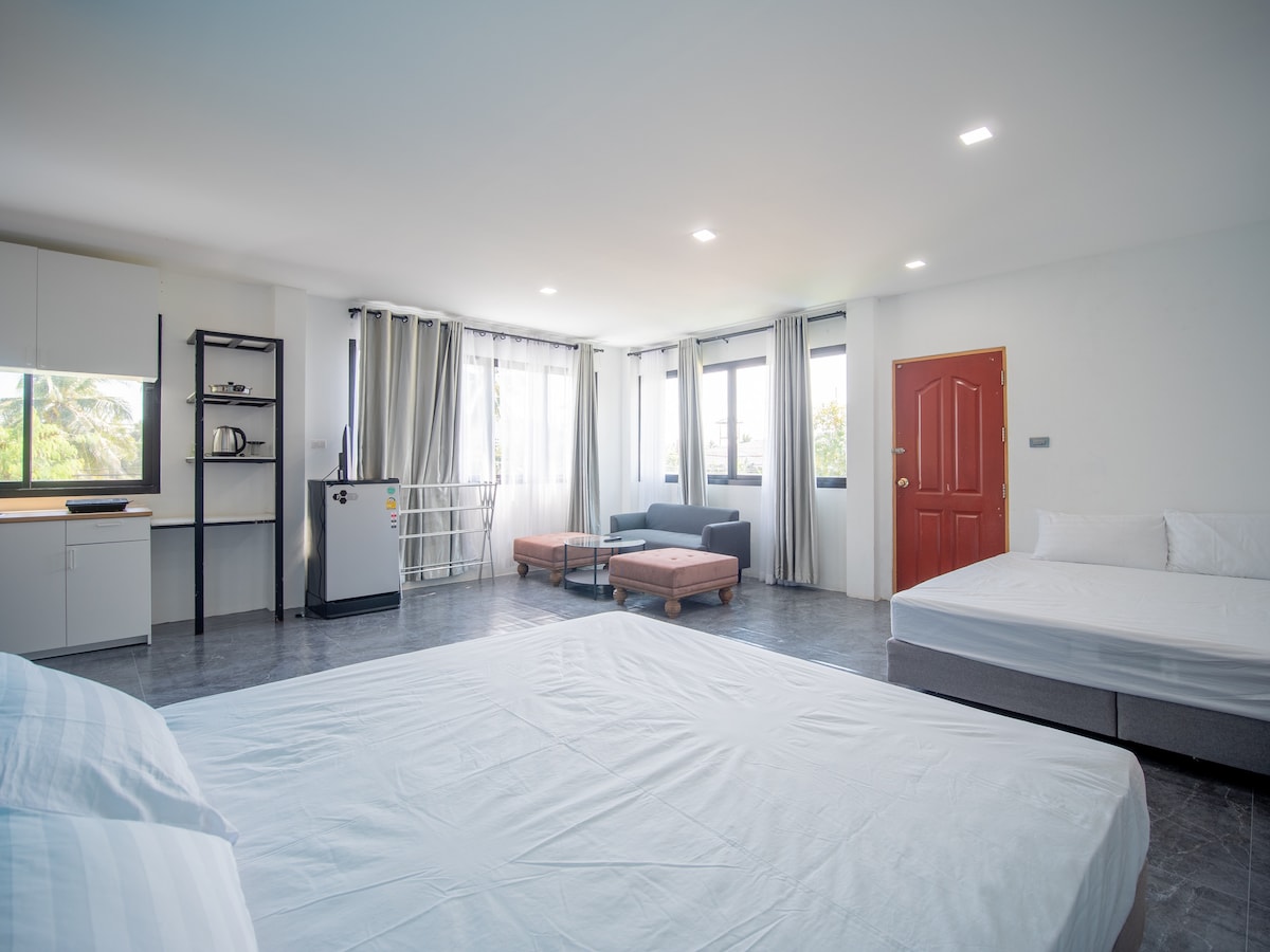Lugar tranquilo a 8 minutos a pie de la playa.Las tiendas de conveniencia, las tiendas de masajes, las farmacias y los restaurantes también están convenientemente ubicados a 2 minutos a pie. La habitación tiene 2 camas tamaño king, un sofá, una mesa de comedor, una zona de cocina sencilla, un refrigerador, un televisor y un armario.También hay una cocina compartida en las instalaciones que puedes usar.