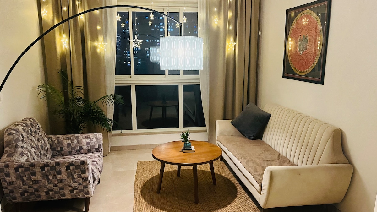 Welcome to your Van Gogh-inspired retreat! Centrally located near the airport and Powai Lake, this stylish 1 BHK flat offers comfort and convenience. Enjoy two TVs, two bathrooms, a dining area, IKEA furniture, spectacular lighting, free WiFi, Amazon Prime, a Caravaan music system, AC, and ceiling fans. Relax on the sofa cum bed or the plush bed in the cozy bedroom. Wake up to a breathtaking hill view and immerse yourself in a world of art and tranquility. Book now!