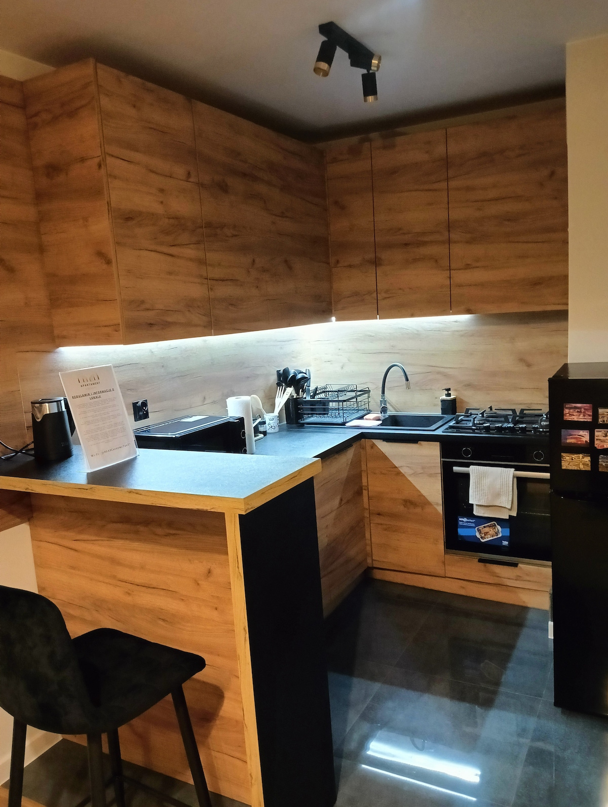El piso está en un moderno edificio de apartamentos en la calle 22 Górna, en Kielce. Incluye una sala de estar con un techo negro que le da profundidad y carácter vanguardista, una cocina funcional y totalmente equipada con comedor, un dormitorio acogedor con una cama doble, un elegante baño con bañera y un balcón con vistas a la ciudad. Cada habitación también cuenta con iluminación LED atmosférica. Hay un estacionamiento gratuito disponible para los huéspedes.