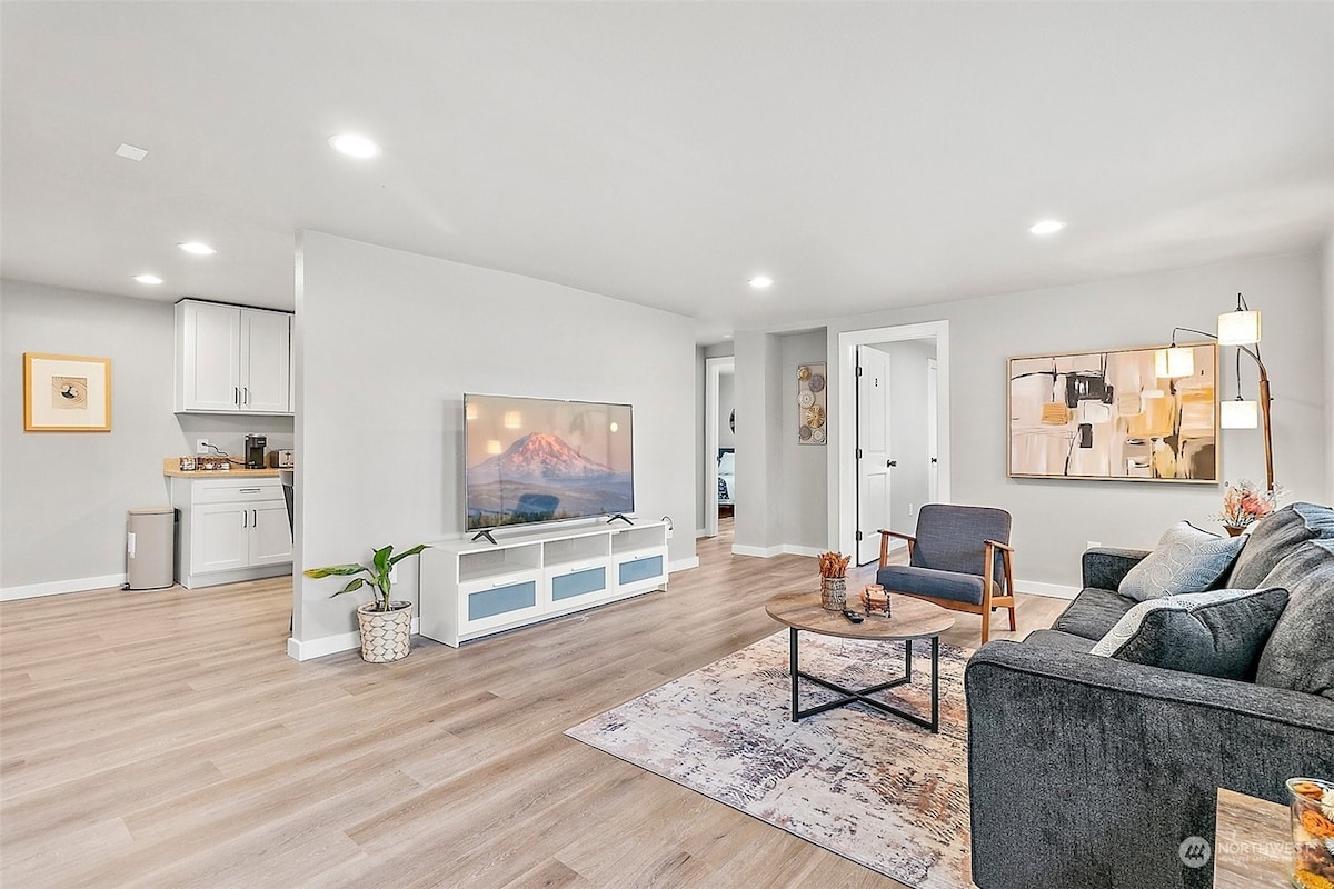 Welcome to Seattle Lighthaus ✨ Enjoy the entire property, an ideal setting for comfortable gatherings. The open-concept main floor features a spacious kitchen, dining area, and living room with TV, perfect for spending time together. Downstairs, unwind in the moody movie lounge or get a light workout in the home gym. Outside, enjoy a covered, heated gazebo and fully fenced yard. Close to major attractions, yet tucked into a quiet neighborhood. The perfect place to unwind after a day exploring!
