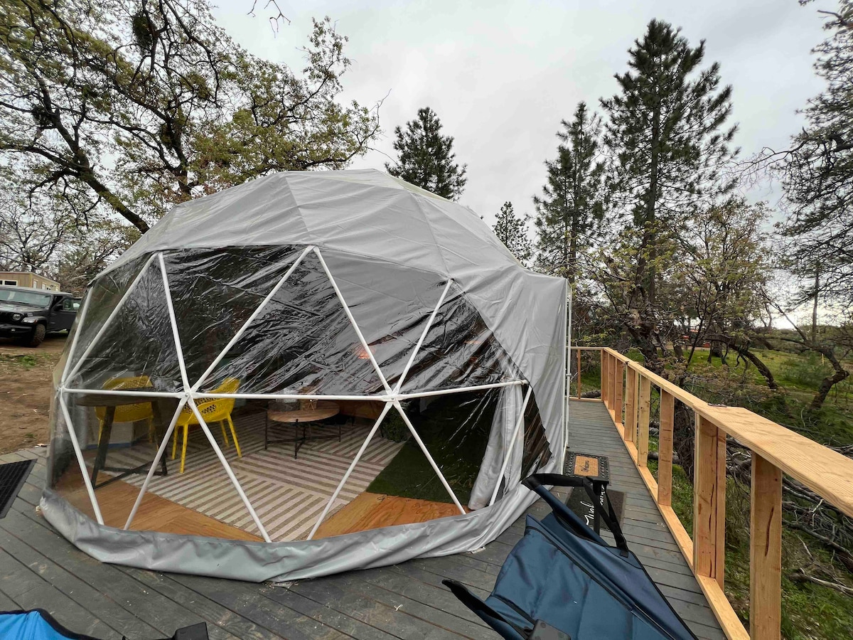¡Glamp con estilo a solo 15 minutos de Kings Canyon y Sequoia! Nuestras acogedoras cúpulas geodésicas se encuentran en 40 acres e incluyen aire acondicionado, WiFi, un televisor inteligente y una enorme ventana con una hermosa vista al bosque. Disfruta de una terraza privada al aire libre, acceso a un moderno baño privado (a 100 pies de distancia) y una cocina comunitaria al aire libre con parrilla. Dome ofrece vistas panorámicas de nuestro hermoso bosque y valle. Tranquilo, único y perfecto para parejas o aventureros solitarios. Durante el invierno, mantente cómodo y caliente con una estufa de pellets.