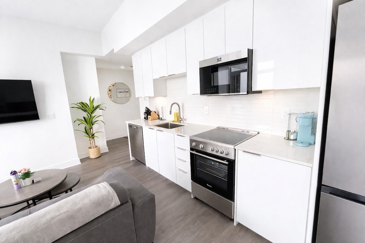 Este condominio de 2 dormitorios es un paraíso para ejecutivos de negocios y parejas que estén buscando una escapada urbana lujosa. Esta morada de diseño profesional cuenta con características de alta gama y alta tecnología y un montón de comodidades que harán que tu estadía sea inolvidable. Mantente al día con tu gimnasio, una piscina, una sauna o ciclismo en la habitación Peleton. Este condominio cuenta con un espacio de estacionamiento y también tienes acceso a un cargador EV en el lugar. Con tantos servicios disponibles, este condominio es el lugar perfecto para hospedarse.