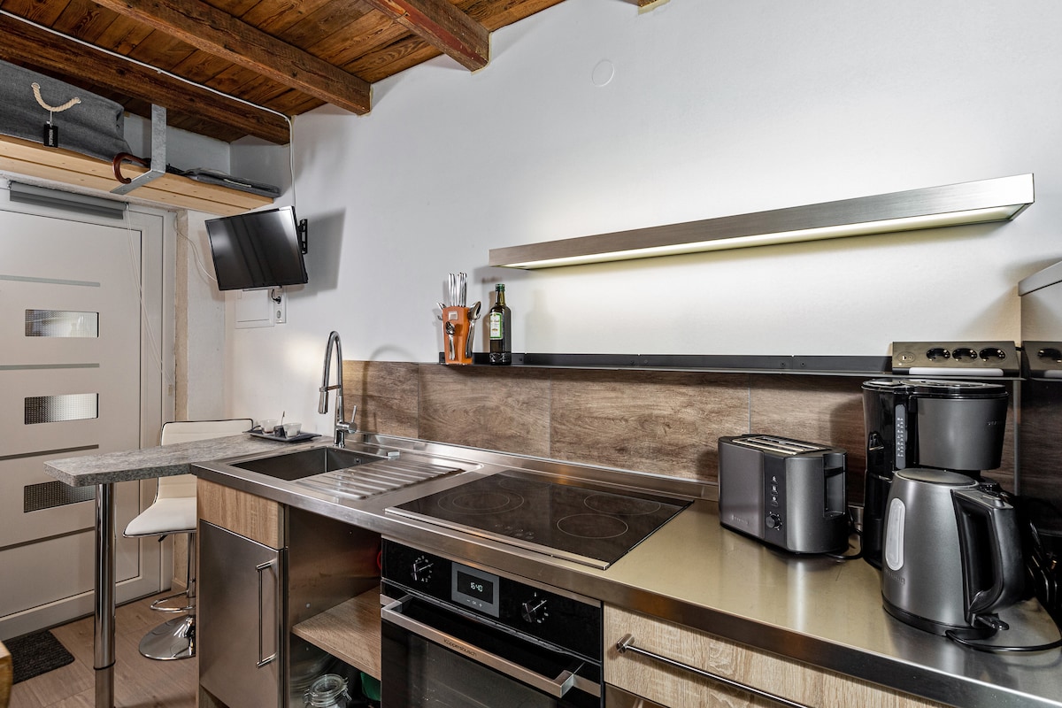 Ubicación / Casa: - decorado con cariño - Para 2 personas - 25 metros cuadrados de superficie habitable - Granja de pollos en la propiedad - Zona de barbacoa y chimenea - Servicio de entrega de panecillos si es necesario Espacios: - 1 cocina con sofá cama (140 cm de ancho) - 1 baño con ducha, inodoro, lavabo, secador de pelo General: - Toallas/ropa de cama incluidas - Uso de la sauna por 20 € al día Cocina: - Cocina de alta calidad - Frigorífico con congelador pequeño - Horno - Placa vitrocerámica - Hervidor de agua - Cafetera - Tostadora - Microondas
