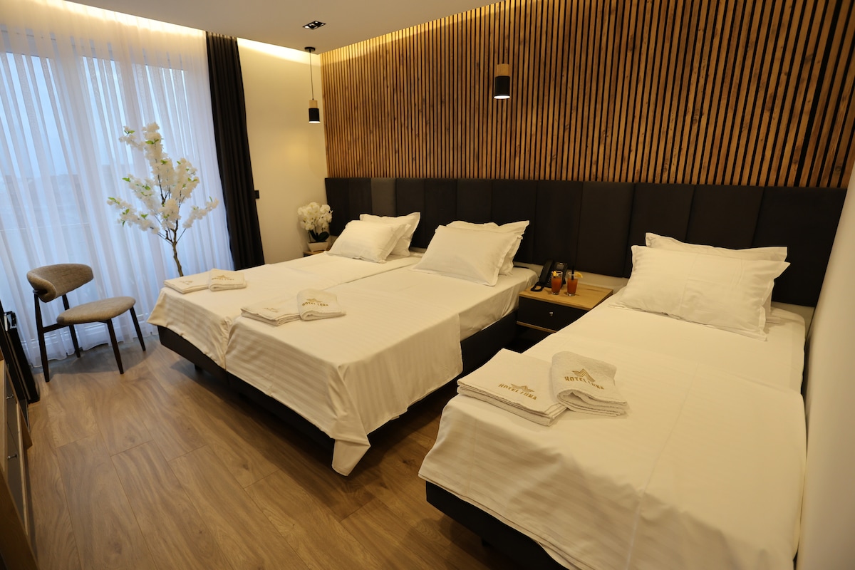 Experience modern comfort in our spacious Double Room, designed to provide a restful retreat in the heart of Prizren. Featuring expansive views of the city's historic skyline, this room is the perfect choice for travelers seeking both relaxation and a front-row seat to the city's vibrant atmosphere.