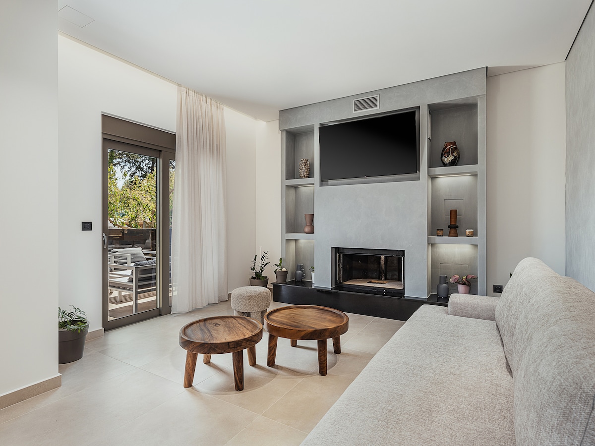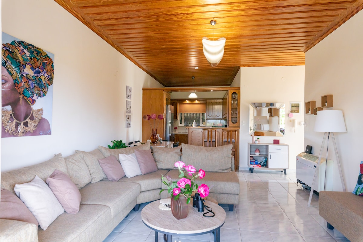 Es un apartamento de 85 metros cuadrados con vistas notables y diseño moderno en un entorno donde el único ruido son los pájaros del bosque. Queremos informarte de que nuestro apartamento NO TIENE AIRE ACONDICIONADO ni electrodomésticos de bajo consumo. Hay aparcamiento a 10 metros de distancia. A 15 minutos a pie se encuentra el supermercado Lidl y hay un minimercado a 300 metros de distancia. Además, el famoso Caffe Koukouvaya está a 10 minutos a pie.