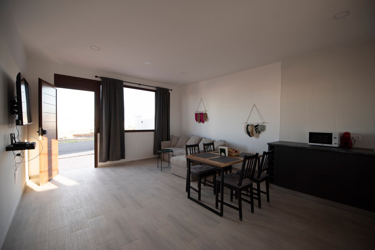 Alójate en uno de los dos encantadores apartamentos hippies modernos de 80 metros cuadrados con una vista única del Parque Nacional de Timanfaya y sus volcanes. El apartamento cuenta con una cocina totalmente equipada, una sala de estar con puertas correderas panorámicas y un sofá cama, TV de alta definición, internet de fibra óptica y un dormitorio con baño privado de estilo canario. Relájate en tu terraza privada, sumérgete en la piscina de agua salada César Manrique, disfruta de las vistas infinitas y maravíllate con las puestas de sol mágicas. 🩵