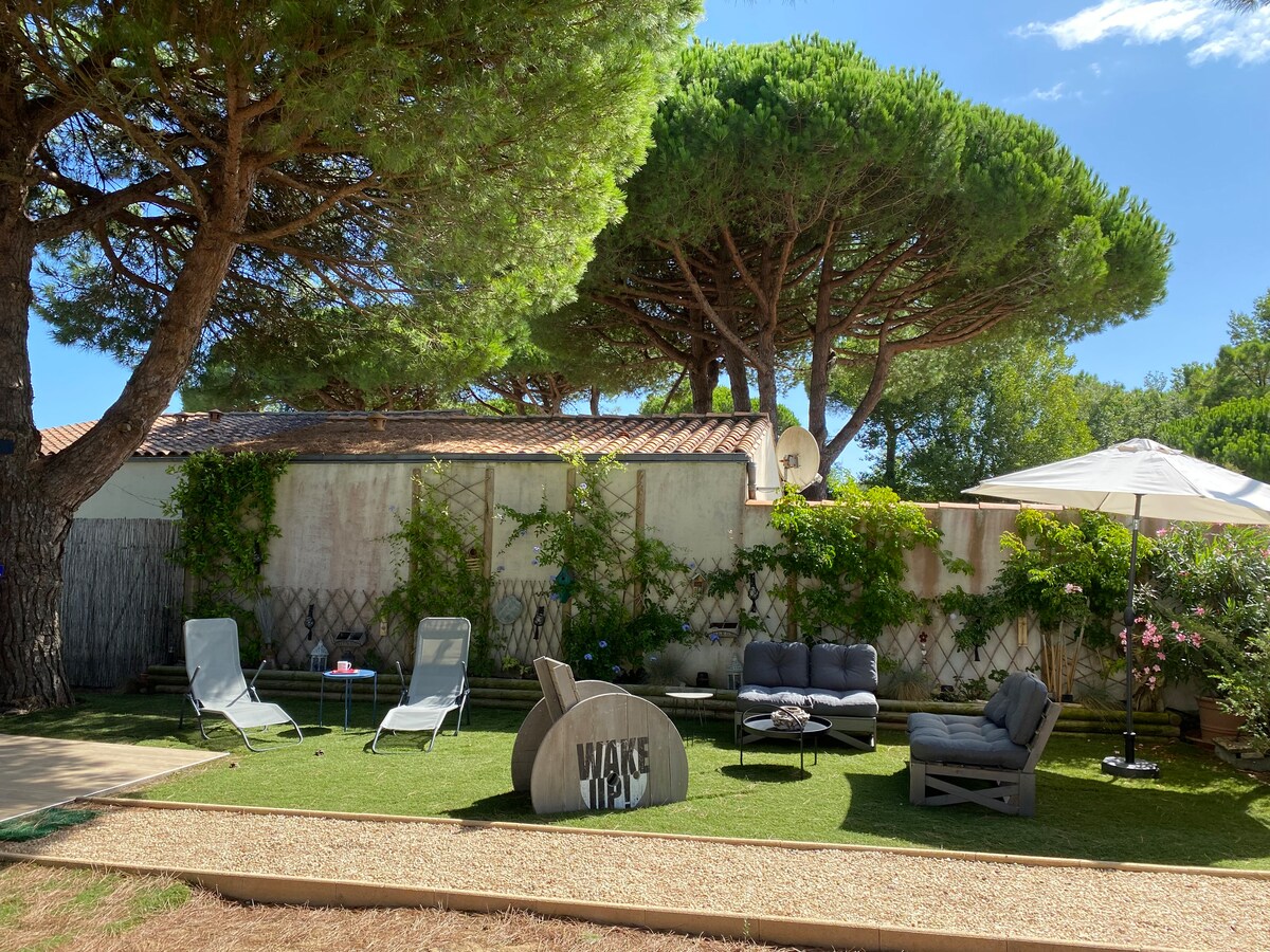 Disfrute de la isla en una villa espaciosa y luminosa organizada alrededor de su patio y piscina, SIN VECINOS. Venga a relajarse en la TRANQUILIDAD mientras está cerca del centro del pueblo (600 m) y de las playas (1 km). Recientemente renovada, su gran y cálida parte de la vida responde con un pasillo luminoso a una parte de la noche nueva y casi independiente. Todas las habitaciones dan al jardín. Ideal para estancias en familia o entre amigos, donde todos pueden vivir a su ritmo.