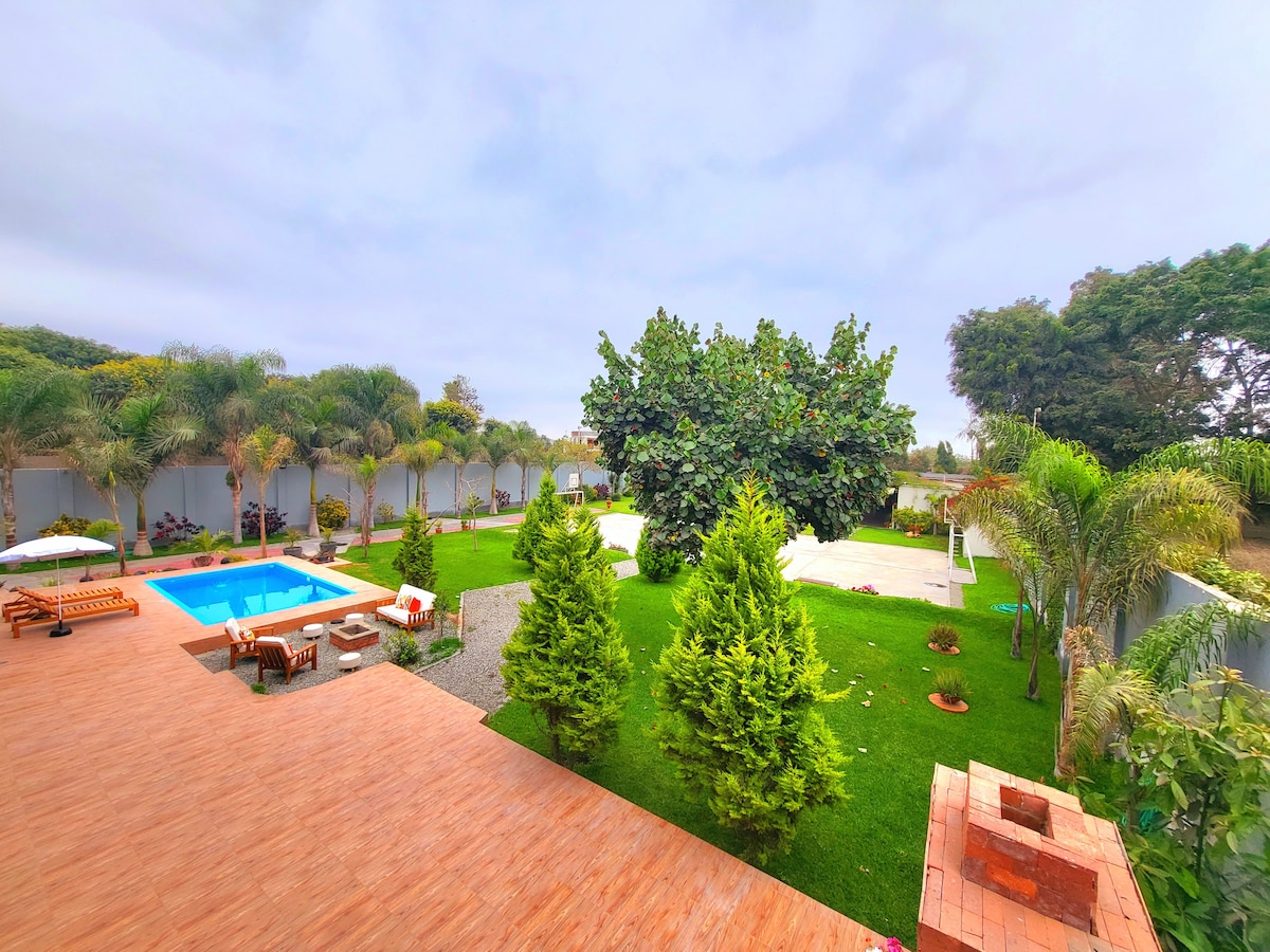 Predio de 3,600m2 con hospedaje hasta para 12 huéspedes, disfruta de una linda vista al jardín desde tu habitación, de día jugando en un extenso jardín de más de 2,400m2 jugando Sapo, fulbito de mano, Saltarín, nadando en una amplia piscina y opcionalmente Jacuzzi (*) o preparado una parrilla, por la noche con unos vinos calentándote frente a la fogata mientras los niños juegan con linternas o acampando con toda seguridad! (*) Servicio de Jacuzzi temperado tiene costo adicional