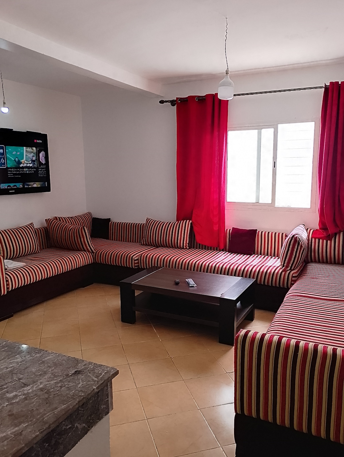 Bienvenido a este encantador apartamento en la planta baja situado en Tánger, idealmente situado cerca de la playa, el bosque y el aeropuerto. Perfecto para estancias en familia, este espacioso alojamiento tiene capacidad para 6 personas. La cocina está equipada para preparar sus comidas como en casa. Disfruta de wifi gratuito, TV, lavadora y aparcamiento seguro dentro de la residencia. Baño funcional, ropa de cama incluida. No se admiten parejas musulmanas no casadas.
