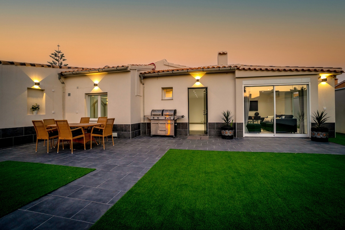 Casas vacacionales más nuevas en estilo moderno y acogedor. Una casa totalmente amueblada con enfoque en buenas camas,edredones, áreas al aire libre,muebles y aire acondicionado en todas las habitaciones. Hay una sombrilla en la azotea, así como una sombrilla fuera de la sala de estar. Piscina ubicada a 10 metros de nuestra propiedad La casa se encuentra en una zona residencial tranquila y aislada que es apta para niños. Solo los propietarios pueden entrar con el auto en la zona. Hay una puerta en el exterior. Apto para niños. A poca distancia de playas, tiendas de comestibles, restaurantes, campos de golf, etc.