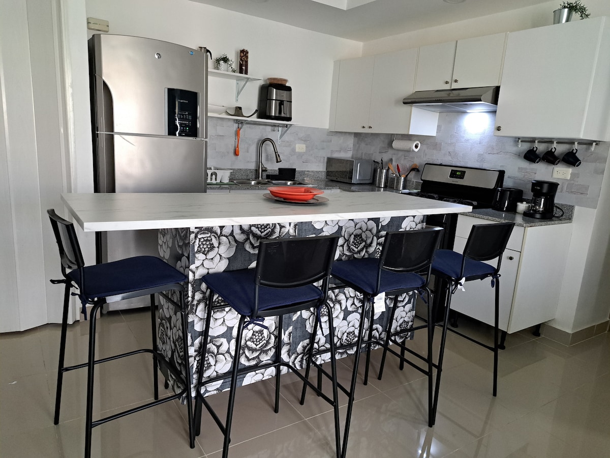 Este departamento de 1 dormitorio con cama tamaño king, 2 baños, sala de estar con cocina equipada, TV LED inteligente con cable, aire acondicionado en la sala de estar y el dormitorio, balcón con vista a la piscina, protección de mosquitero en ventanas y puertas del balcón y acceso gratuito a Internet de alta velocidad. ESTE DEPARTAMENTO FUE TOTALMENTE RENOVADO EN OCTUBRE DE 2018. El espacio LOS SERVICIOS INCLUYEN: - Cocina totalmente equipada. - Artículos de tocador. - Televisión con cable - Una botella de agua de 5 galones incluida.