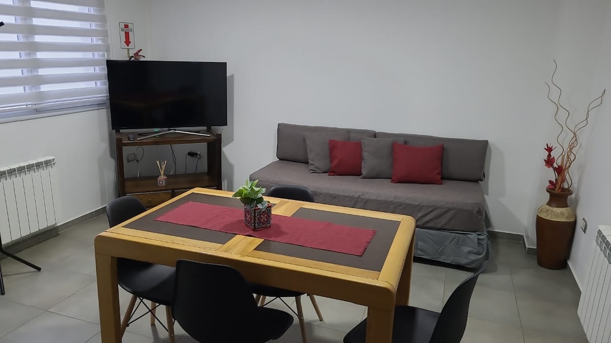 Es un departamento de cincuenta metros cuadrados . Tienen cocina equipada con todos los elementos , una habitación totalmente privada , con camas individuales o matrimonial según elección , el otro espacio tiene tiene camas simples o matrimonial a elección ,este espacio comparte con el living comedor , baño privado con calefacción . Ubicación , a 10 minutos en auto del centro de la ciudad, todos los pasajeros son bienvenidos.