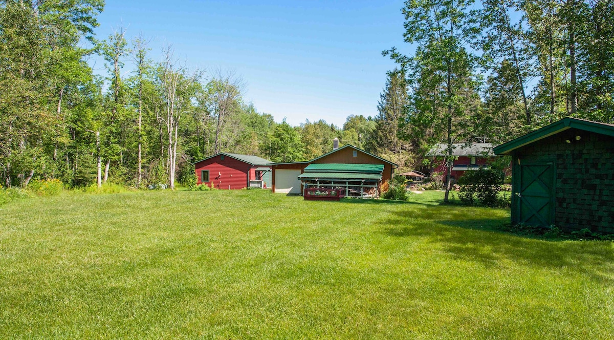 Una cabaña de madera de cedro única, de octágono, situada en 40 acres boscosos aislados. Una corta caminata sobre el río Sucker en un puente peatonal de cuentos hasta una generosa terraza que rodea la cabaña. Tendrás que estar en forma física para alojarte aquí. Debes subir una escalera empinada hasta el desván y hacer un escalón de 2 pies para bajar de la cubierta a la tierra pantanosa de abajo para hacer un fuego. ¡También trae una sensación de aventura! La vida silvestre está muy cerca. No permitimos animales ni fumar de ningún tipo, lo sentimos.