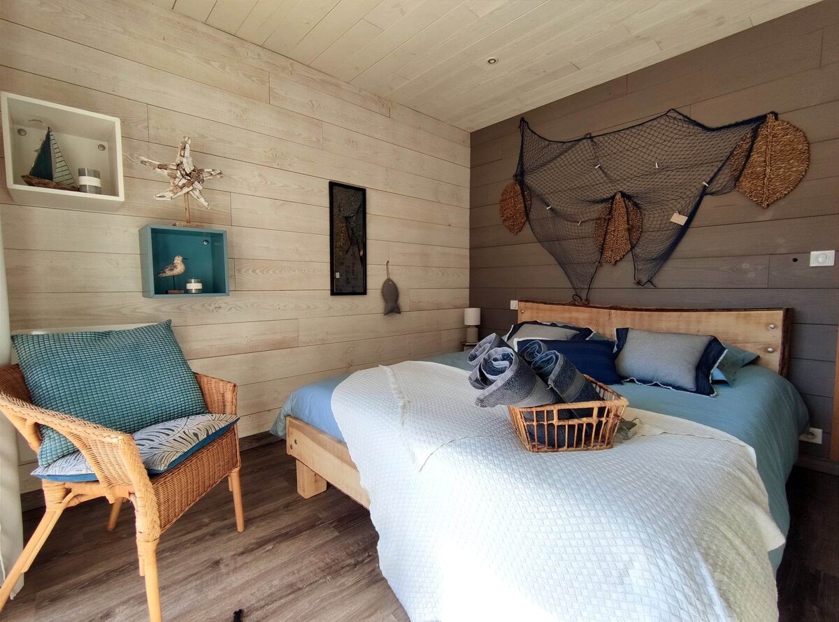 Mi alojamiento está idealmente situado,a 500 m del lago, a 200 m del campo de golf y a 6 km del océano.Es una cabaña de 25 m2 con sala de estar, televisión y nevera. También consta de una zona de dormitorio con cama de 160 y ropa de cama de alta gama. Tiene acceso totalmente independiente,con una terraza privada. También hay una cocina compartida a su disposición. This cabin is located near Biscarrosse's lac and golf, it includes comfortable bedding, ideal for couples.