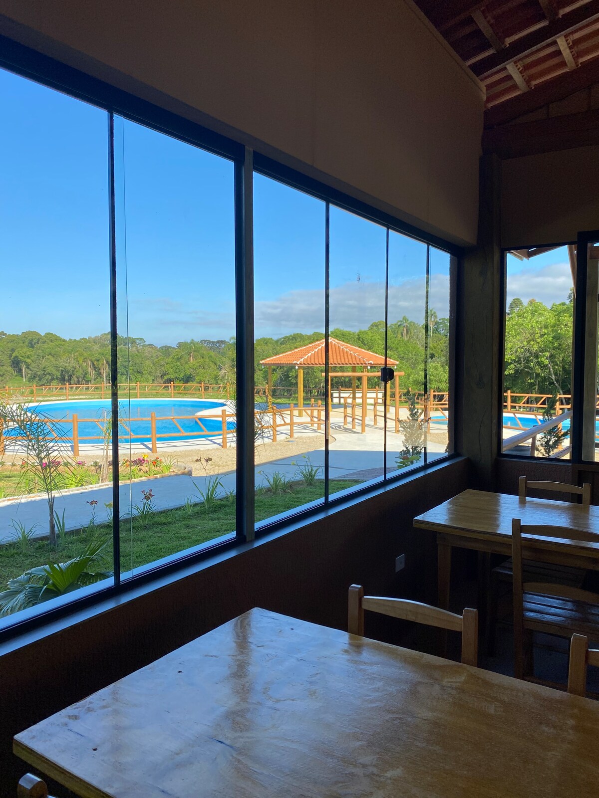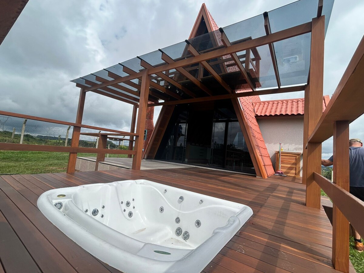 Chalé Pôr do Sol construido con madera dura, con acabados de primer nivel, muebles incorporados, barbacoa, jacuzzi CLIMATIZADO y una amplia terraza, internet gratuito a través de fibra, perfecto para una estancia en el campo con absoluta privacidad. El ambiente transmite calidez y tranquilidad, en armonía con la naturaleza circundante, con lagos, senderos, plantaciones, caballos y más. Tiene una zona de ocio con cancha de arena (playa Tênis, Futvolei), campo de fútbol, lago de pesca y senderos.