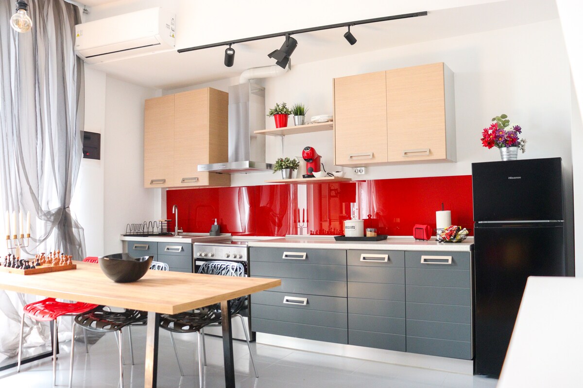 Un moderno y cómodo estudio semisótano (dormitorio, sala de estar, cocina, baño, oficina), decorado con influencias industriales, en uno de los distritos más hermosos de Larissa. Está adaptado exclusivamente a las necesidades y requisitos de los huéspedes de Airbnb, con muebles y electrodomésticos nuevos, calefacción central de gas natural y equipada con todas las comodidades modernas (Cosmote Tv, Internet 100 Mbps, etc.). ¡Será un placer ofrecerte una estancia agradable!