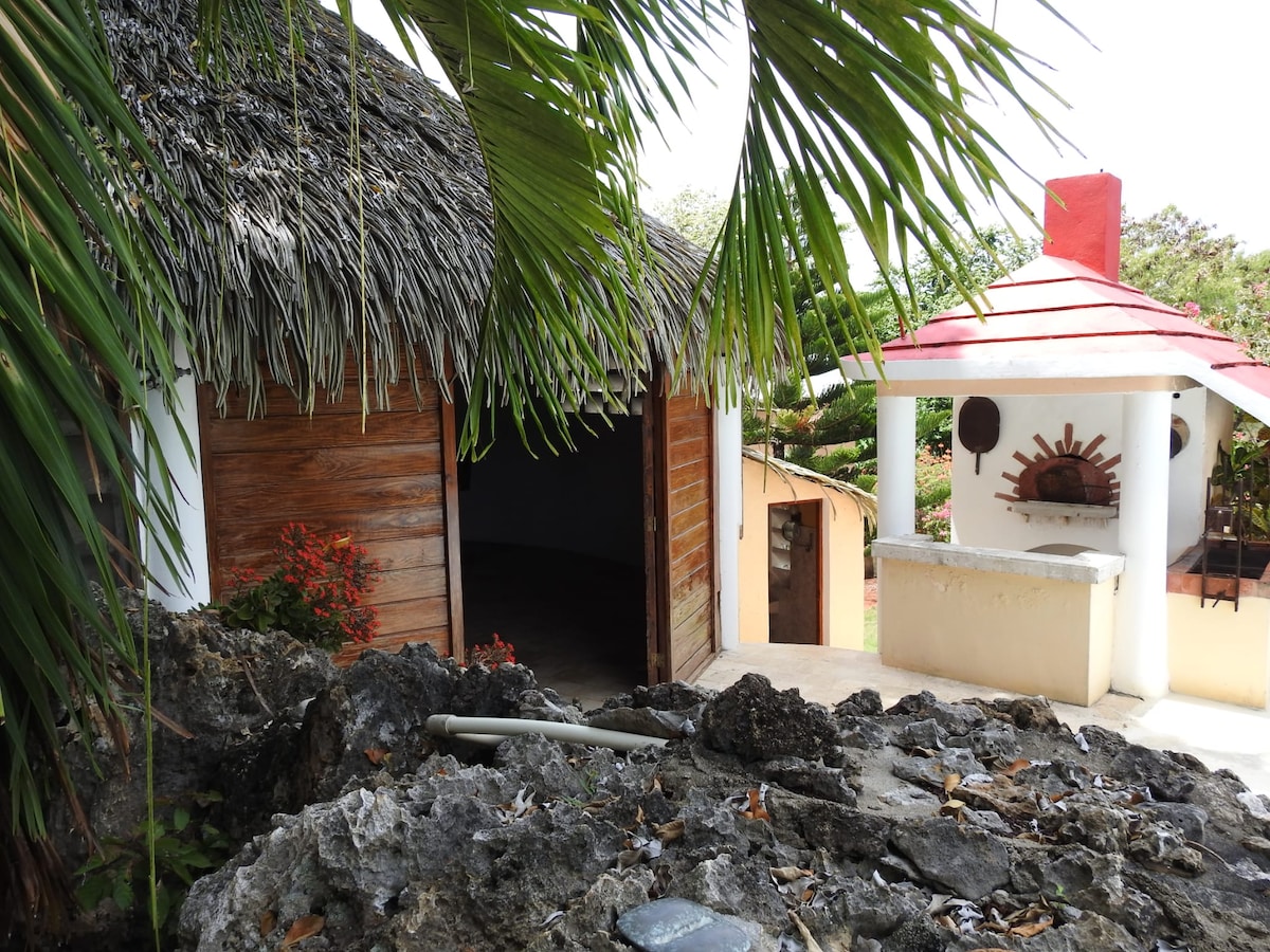 Encantador estilo rústico... cabaña única, a pasos de nuestra hermosa playa cristalina Javo en Playita. Cama queen, cocina completa, un encantador baño al aire libre, aire acondicionado, wifi, un pequeño jardín y terraza. La cabaña cuenta con reja de seguridad y circuito cerrado de televisión. Se ofrece desayuno de bienvenida gratuito.