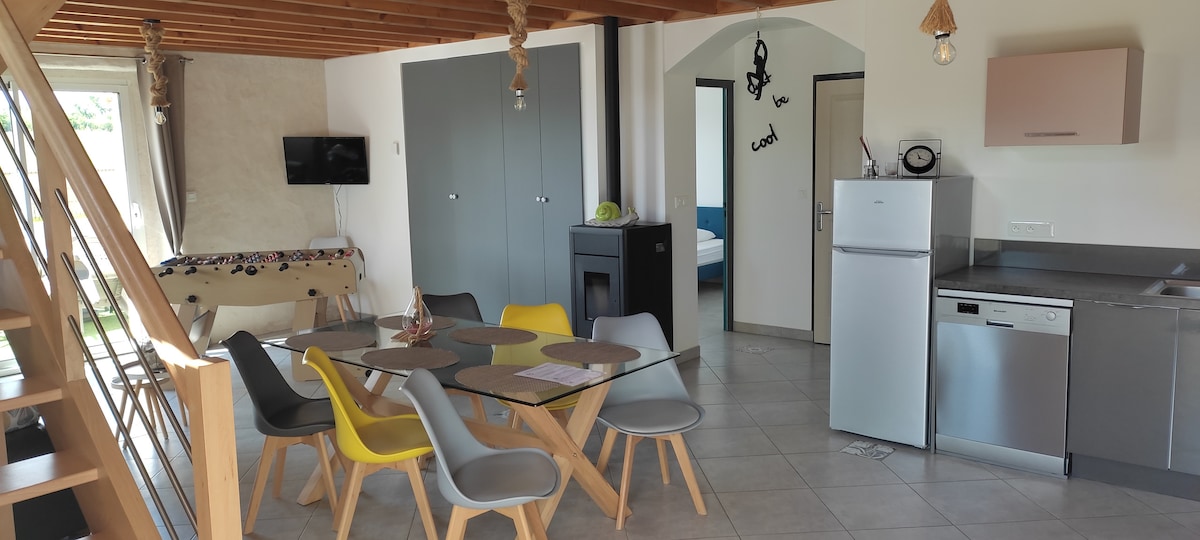 Situé à la campagne dans un petit hameau calme .Ce logement est indépendant et mitoyen avec notre logement . , .Il y a un jardinet clos,engazonné et fleuri. Une terrasse en bois avec table,chaises,voile d'ombrage et transats. Nous acceptons uniquement 1 chien et de petite taille et pas chien de categorie( staff,rott etc...) Nous ne voulons aucune fête dans le logement, pas d'anniversaire, ni réveillon.