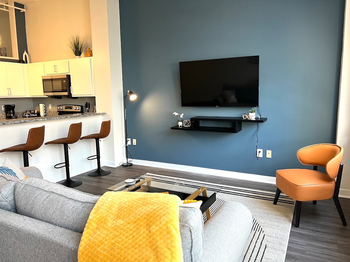 Ubicado en el centro de la ciudad, este apartamento te conecta con el estadio Lucas Oil, el Centro de Convenciones, Gainbridge Fieldhouse, restaurantes de 5 estrellas y a pocos pasos del White River State Park. Totalmente amueblado con muebles Ashley, este apartamento cuenta con una cama tamaño queen con tocador, sala de estar con sofá modular y una vista de prestigio de las calles de Indianápolis, y una cocina con un juego completo de utensilios y electrodomésticos. Disfruta de wifi gratuito y de un baño después de usar el gimnasio y el teatro de la 6.ª planta.