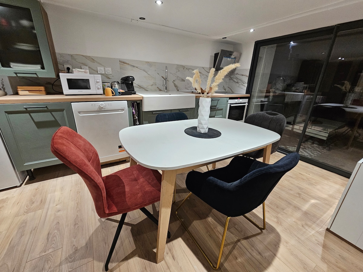 Compuesto por un gran salón cálido que incluye un amplio sofá cama, así como un verdadero comedor, un dormitorio con una cama de 2 plazas, baño y aseo separados. Cocina funcional y equipada que le permitirá almorzar y cocinar fácilmente. Pequeño aperitivo ofrecido el primer día: té, tisana, café, magdalenas. Se proporcionan toallas, la cama está hecha a la llegada . Gran armario de almacenamiento para guardar sus maletas voluminosas y sus pertenencias personales.