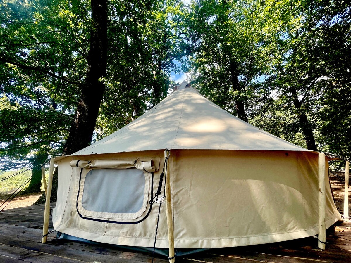 Bajo árboles antiguos en un paisaje maravilloso, hay una gran tienda de algodón colocada en una gran terraza de madera, con una vista impresionante. La tienda tiene un diámetro de 5 metros y está equipada con una cama para 2 personas, 2 camas individuales (si es necesario), alfombras en el suelo, electricidad y agua. La tienda está garantizada para ser resistente al agua y el espesor de la lona ofrece suficiente protección contra el viento. Delante de la tienda hay una gran terraza con una mesa, sillas y tumbonas.