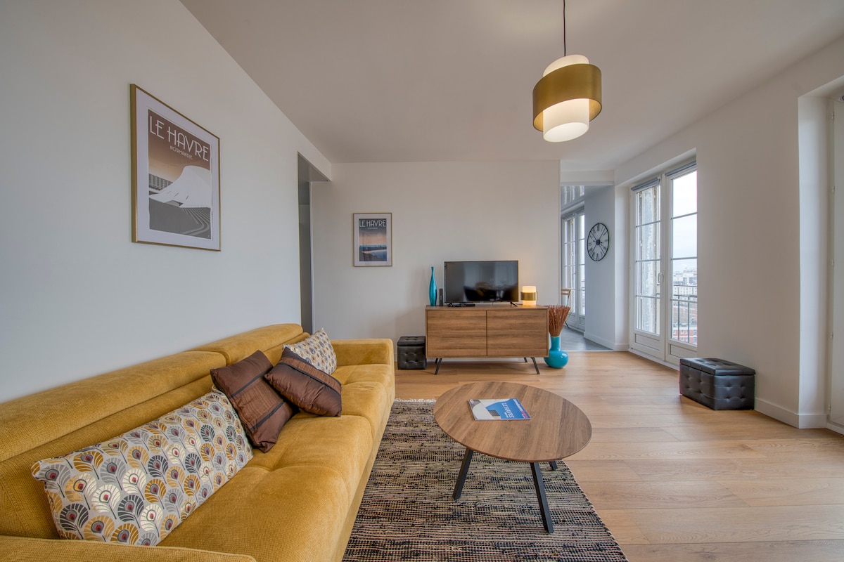 🏬En el corazón del centro de la ciudad reconstruido por el famoso Auguste Perret, nuestro apartamento recién renovado goza de una agradable vista del mar gracias a su planta alta Está perfectamente equipado, se sentirá como en casa 🍹Las tiendas, bares, restaurantes están cerca, en el corazón de la calle peatonal y los lugares culturales de Le Havre 🚃El tranvía está a 1 minuto a pie y la playa a 10 minutos ¡🏖Un ambiente cálido, luminoso y cómodo para este pequeño nido acogedor que nos encanta! 😍