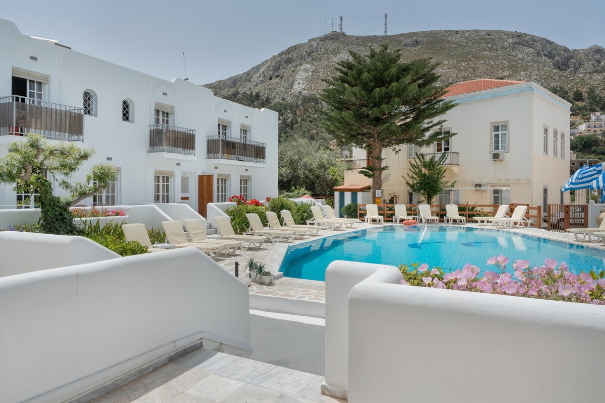 El apartamento vacacional Double Room Pool View No 3 se encuentra en Kalymnos y tiene vistas a la montaña. La propiedad de 35 m² consta de una sala de estar, 1 dormitorio y 1 baño, por lo que puede alojar a 2 personas. Los servicios adicionales incluyen Wi-Fi de alta velocidad (apto para videollamadas), televisión y aire acondicionado. Este alojamiento ofrece acceso a una zona exterior compartida con piscina, jardín, parque infantil y ducha al aire libre. La propiedad está cerca de la playa.
