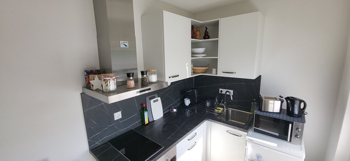 El apartamento de 38 metros cuadrados, decorado con gusto, dispone de 1 dormitorio, 1 baño, sala de estar y cocina. Puedes empezar el día con un delicioso café NESPRESSO y disfrutar de todas las comodidades de este apartamento. El dormitorio tiene una acogedora cama doble de 1,60 m. En el salón hay un comedor para 3 personas y una acogedora sala de estar con sofás y un gran televisor inteligente de 55 pulgadas.