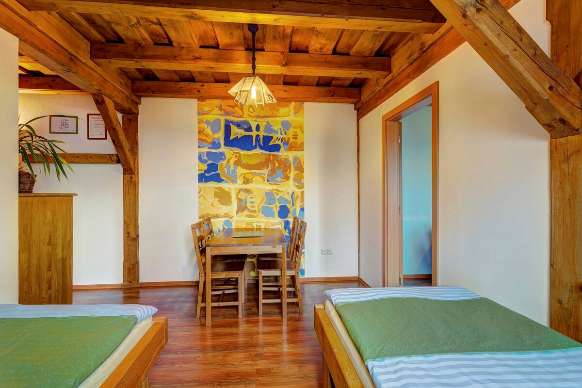 El orgullo de nuestro hotel Švamber House es un apartamento loft. En espacios de diseño generoso, te impresionarán las originales vigas medievales expuestas y restauradas. La suite tiene un área de relajación espaciosa con TV. El baño está equipado con una ducha, bañera, inodoro y secador de pelo.