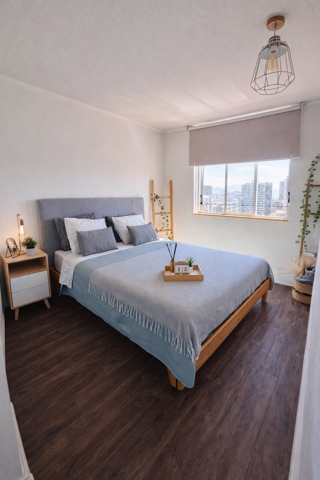 Vive una gran experiencia en un ambiente lleno de luz y diseño. Ubicado a solo media cuadra del Metro, con conexión inmediata a autopistas y servicios, ofrece la mezcla perfecta entre comodidad y ubicación estratégica. Incluye estacionamiento gratuito y capacidad para 4 personas. Destacados: • Acceso: Ingreso autónomo con cerradura inteligente y conserjería 24/7. • Equipamiento: WiFi rápido, Smart TV, sábanas y toallas. • Extras: Lavandería, áreas verdes. y juegos