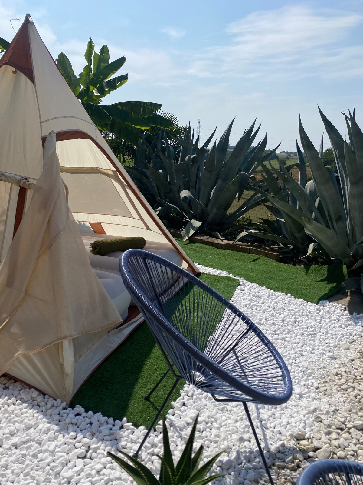 Desconecta: duerme bajo las estrellas en un tipi mágico ✨ Escapa de la rutina y redescubre el silencio y la relajación. Hoy, desde Ni Green House, tienes la posibilidad de dormir entre agaves gigantes y plátanos, arrullado por el canto de las cigarras. A pocos minutos de Monza y Lecco, pero a años luz del ajetreo y el bullicio. Desayuno incluido. Aperitivo al atardecer disponible bajo petición. (Extra a convenir) Ducha al aire libre, cielo infinito, naturaleza viva. 🌿 * Aquí el tiempo se ralentiza. Y realmente respiras.*