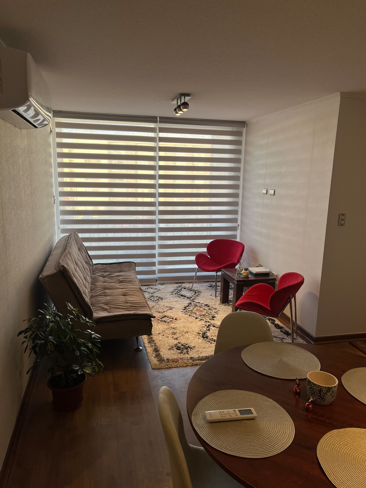 Disfruta de una cómoda estadía en este dpto. de uso habitacional, ideal para viajes personales o de descanso. Cuenta con wifi, aire acondicionado, sábanas y toallas. Estacionamiento subterráneo. Ubicado cerca de supermercados, clínica, pubs y restaurantes. A 5 minutos en auto del terminal rodoviario y locomoción colectiva a media cuadra. La limpieza se realiza solo ENTRE estadías. No se ofrecen servicios adicionales. Lavadora y secadora de ropa no disponibles.