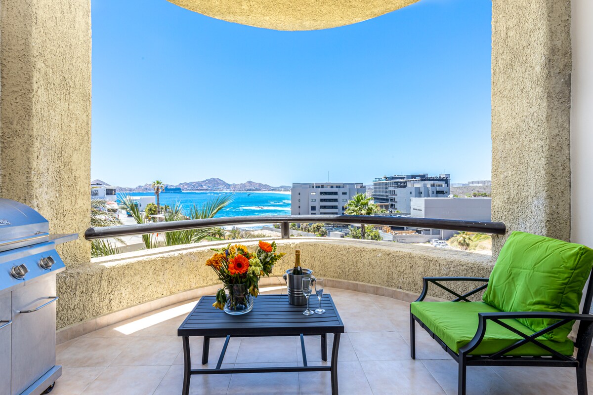 - Impresionantes vistas a la bahía y al Arco desde tu terraza privada! - Canchas de tenis, alberca climatizada y gimnasio totalmente equipado. - Dos amplias habitaciones para 6 personas, con espacio de trabajo, cocina completa y lavadora/secadora. - Camina 5 minutos a Costco y Soriana para tus compras o visita los restaurantes y la vida nocturna de la marina. - ¡Reserva ahora para una experiencia con todas las comodidades y un fabuloso anfitrión!
