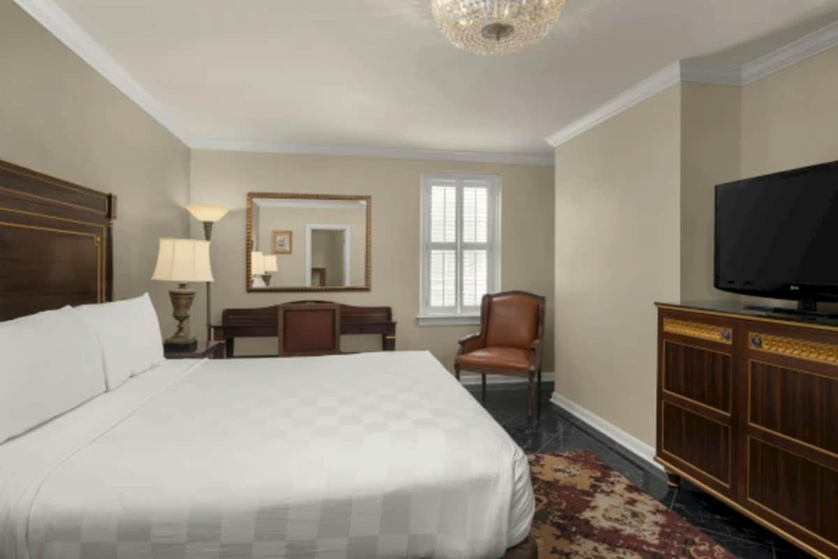Nuestra habitación Petite King incluye una cama tamaño king y tiene vistas a nuestro patio privado de estilo Nueva Orleans. El baño tiene un área de tocador separada, una ducha a ras de suelo y albornoces de algodón. Las comodidades de las habitaciones de hotel de lujo incluyen un colchón con la parte superior acolchada, conexión Wi-Fi gratuita, cafetera, nevera, caja fuerte en la habitación y un reloj despertador con una estación de acoplamiento para iPhone. Algunas habitaciones del hotel Petite King pueden requerir el uso de escaleras.