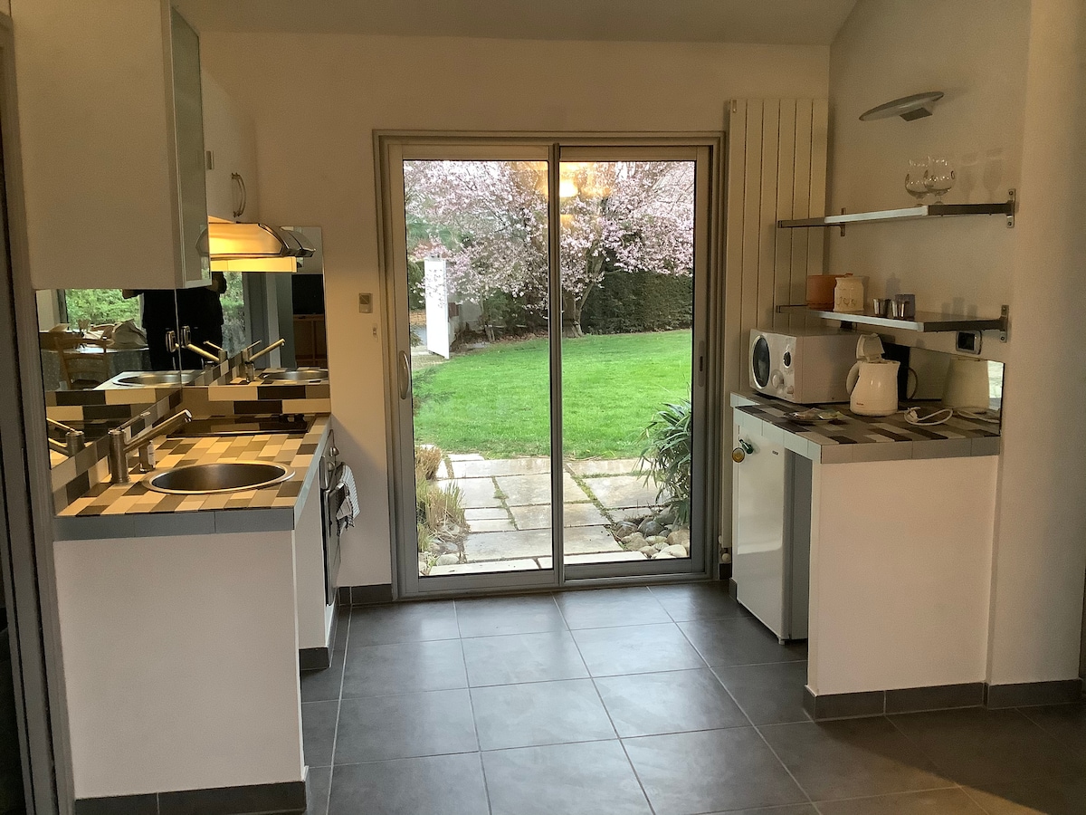 Disfrute de una agradable estancia tranquila en un estudio nuevo en el campo, espacioso, con entrada independiente, situado cerca de la salida A89 (5 minutos), la salida A6 (15 minutos) y el tren TER (a 3 km). - Cocina americana totalmente equipada: nevera, lavavajillas, microondas, placas de inducción, cafetera, hervidor de agua, vajilla - Una cama doble y un sofá cama - Cuarto de baño con ducha italiana y WC privados - 2 televisores y un proyector de vídeo (muchas películas) - Muebles de jardín privado