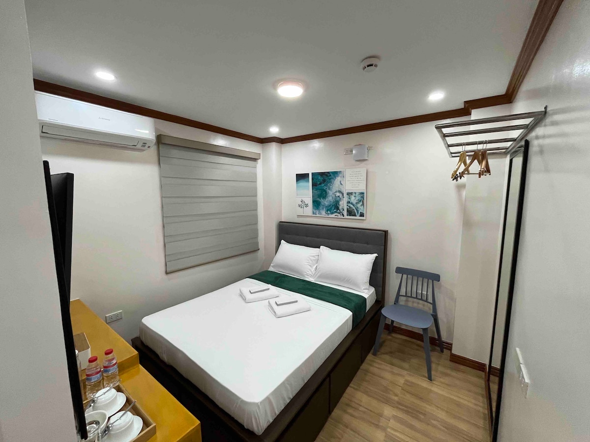 El estudio queen es un cómodo espacio para no fumadores de 26 metros cuadrados con una cama tamaño queen y ducha fría y caliente. La azotea, ubicada en el sexto piso, es un área designada para fumadores y usuarios de vape. Hay wifi en todas las plantas, incluida la azotea. Los huéspedes pueden disfrutar trabajando o relajándose en la azotea con vistas al monte Banahaw. Para las personas que traen sus dispositivos, también hay enchufes eléctricos disponibles en la azotea.
