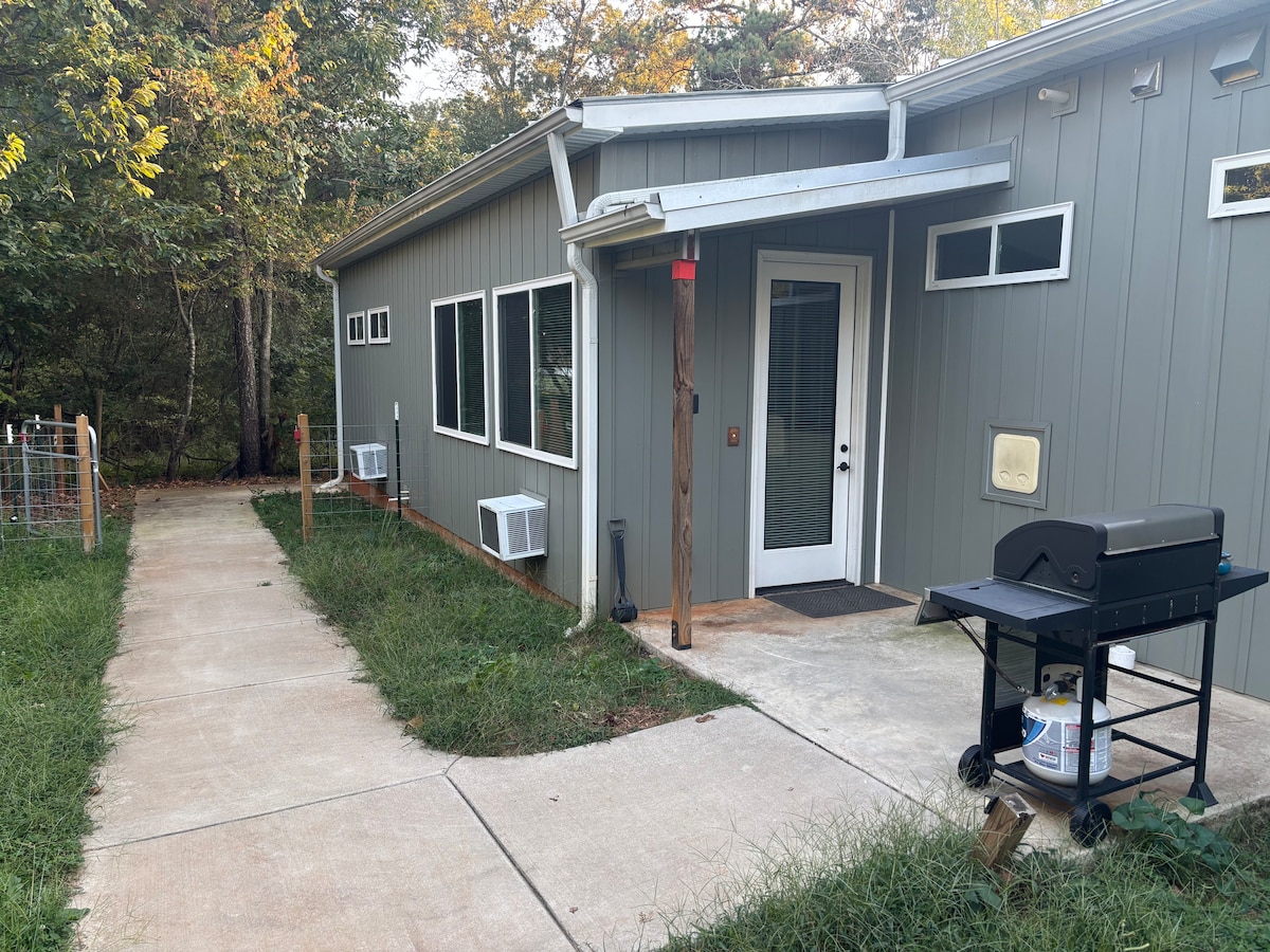Tu estudio en el sótano, organizado por Stout Rentals LLC, incluye el uso de una piscina de 30 000 galones, muebles de patio y flotadores. Tienes una entrada privada, una cama tamaño queen, cocina completa en suite con bonitos electrodomésticos de estilo retro y baño en suite con ducha accesible. Justo al lado de la autopista 72 en Huntsville, a menos de 15 minutos de Research Park y Gate 9, esta propiedad de más de 1 acre está llena de árboles frutales, rodeada de follaje en una subdivisión tranquila. No se admiten niños.