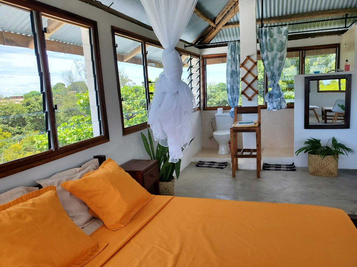 Gran estudio con vistas panorámicas de 360° al amplio parque privado y al mar. Estamos literalmente en el dosel, flores y pájaros. Muebles de palisandro y paletuvier están en armonía con la naturaleza. ¡Lujo, calma y voluptuosidad! El efervescente centro de la ciudad de Majunga a 15 minutos es fácilmente accesible en autobús, taxi o badjaj. Pero no es necesario correr por la ciudad para encontrar peces aún agitados, langostas y compañeros recién salidos de la agua. Buena estancia y buen provecho