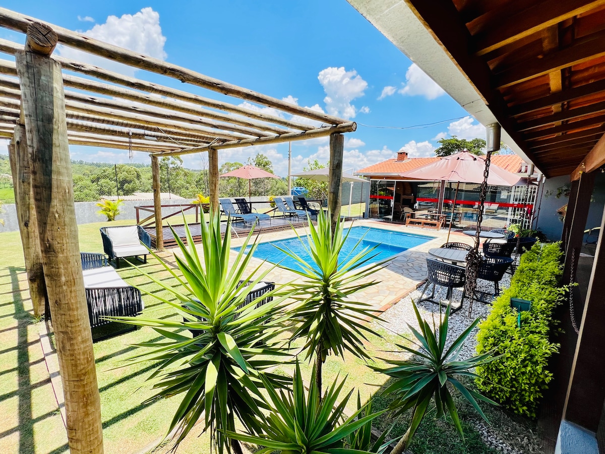 ¡Relájate con toda la familia, tu ocio te espera aquí!Ven y vive un sueño, a 50 minutos de SÃO PAULO, aléjate de la rutina diaria, una casa completamente rústica que te brinda paz y tranquilidad/comunidad cerrada, casa con piscina, barbacoa, estufa de leña, horno. Piscina climatizada, vistas al atardecer, capacidad para 7 personas, wifi, TV de 75", Netflix, Prime, Paramount, Premiere mercado, bodega,pizzería,panadería a 10 min (entrada al parque acuático a 60 $) Sala de estar con piscina grande y para niños, zona de barbacoa y ping pong