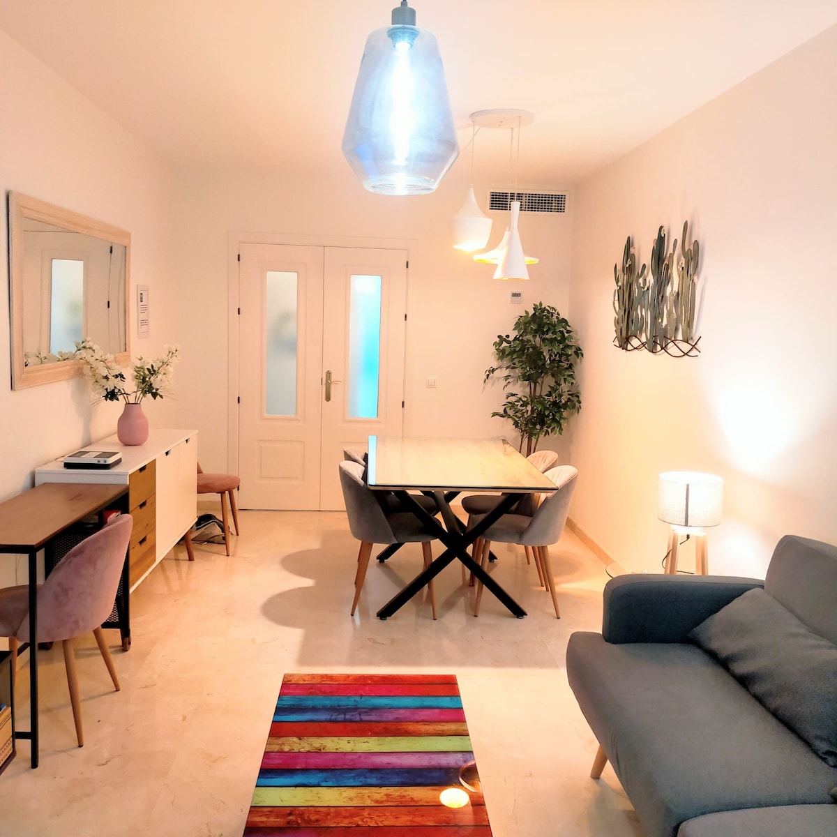 Disfruta de una experiencia elegante y cómoda en este escondite elegante recientemente renovado y céntrico, en el corazón vibrante del casco antiguo de Málaga. Te alojarás en un departamento encantador, colorido, luminoso y totalmente climatizado decorado con muchos toques individuales, equipado con una cocina moderna, un comedor, sala de estar con sofá cama y TV LED de pantalla plana y dos amplios dormitorios, cada uno con su propio baño privado.