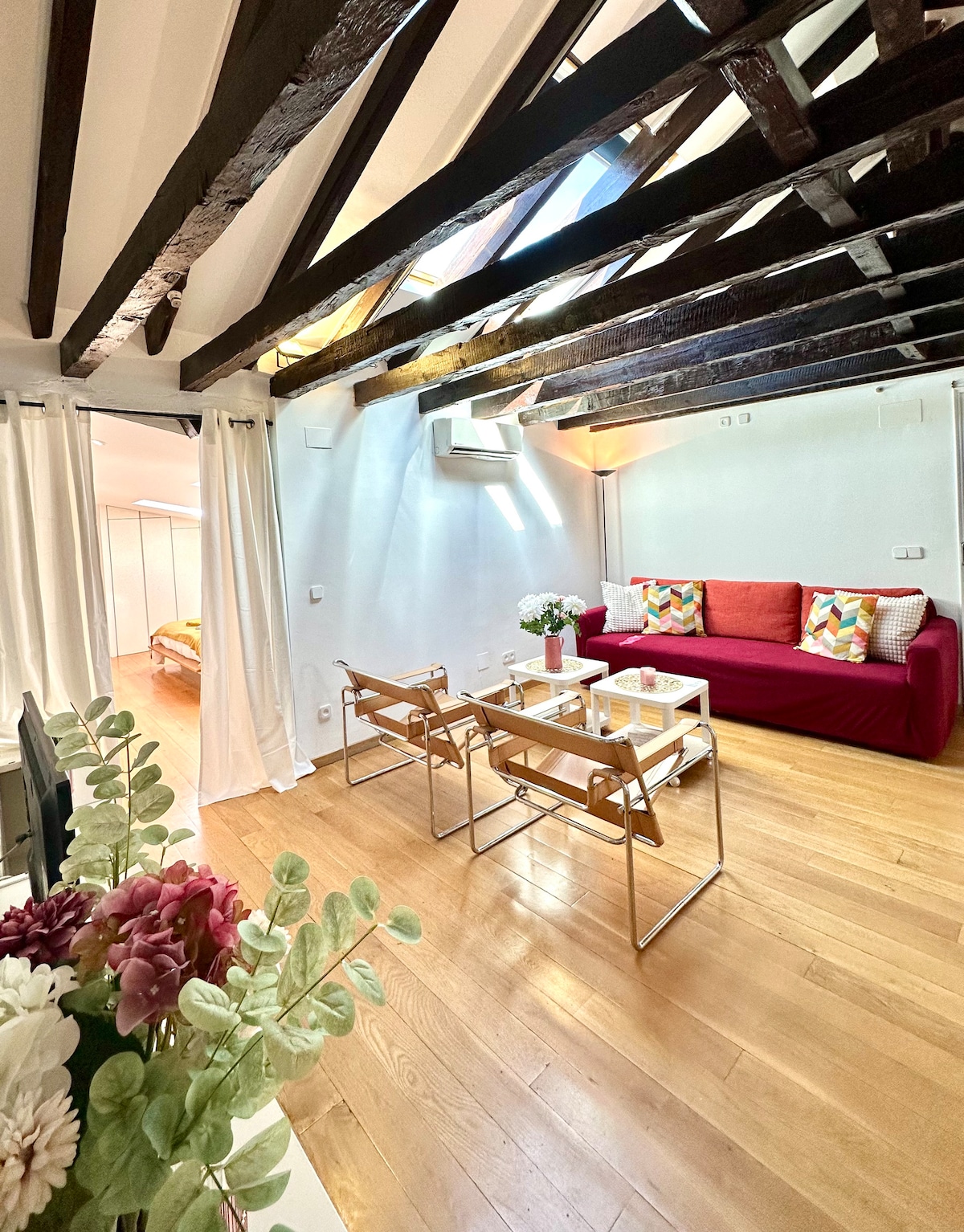 Luminoso y acogedor loft en el corazón de Malasaña, uno de los barrios más vibrantes y creativos de Madrid. Con 40 m², techos altos y vigas de madera vistas, ofrece un ambiente cálido y con personalidad. Cuenta con cocina equipada, zona de estar con sofá, cama muy cómoda y baño tipo wet room, un espacio integrado con ducha, lavabo e inodoro. Fue mi estudio fotográfico, hoy reconvertido en un lugar único, ideal para escapadas en pareja.