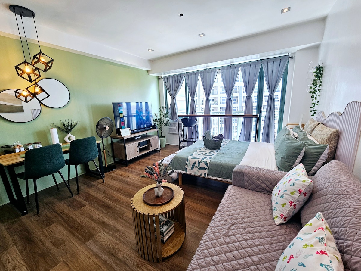 ¡Kamusta! Somos Jade y Sheryl, y nos encantaría darte la bienvenida a nuestro moderno estudio Acqua. Es un lugar tranquilo justo enfrente del puente Estrella-Pantaleón, frente a las elegantes cafeterías, restaurantes y el centro comercial Power Plant de Rockwell. Relájate en una cama tamaño queen, cocina en una cocina totalmente equipada, transmite en una televisión inteligente de 50" con Netflix y Prime, y trabaja o juega con Wi-Fi rápido de 400 Mbps. También disfrutarás de acceso a las refrescantes piscinas y jardines de Acqua, al gimnasio en la azotea, a las prácticas tiendas y a la tranquilidad de contar con seguridad las 24 horas del día, los 7 días de la semana.