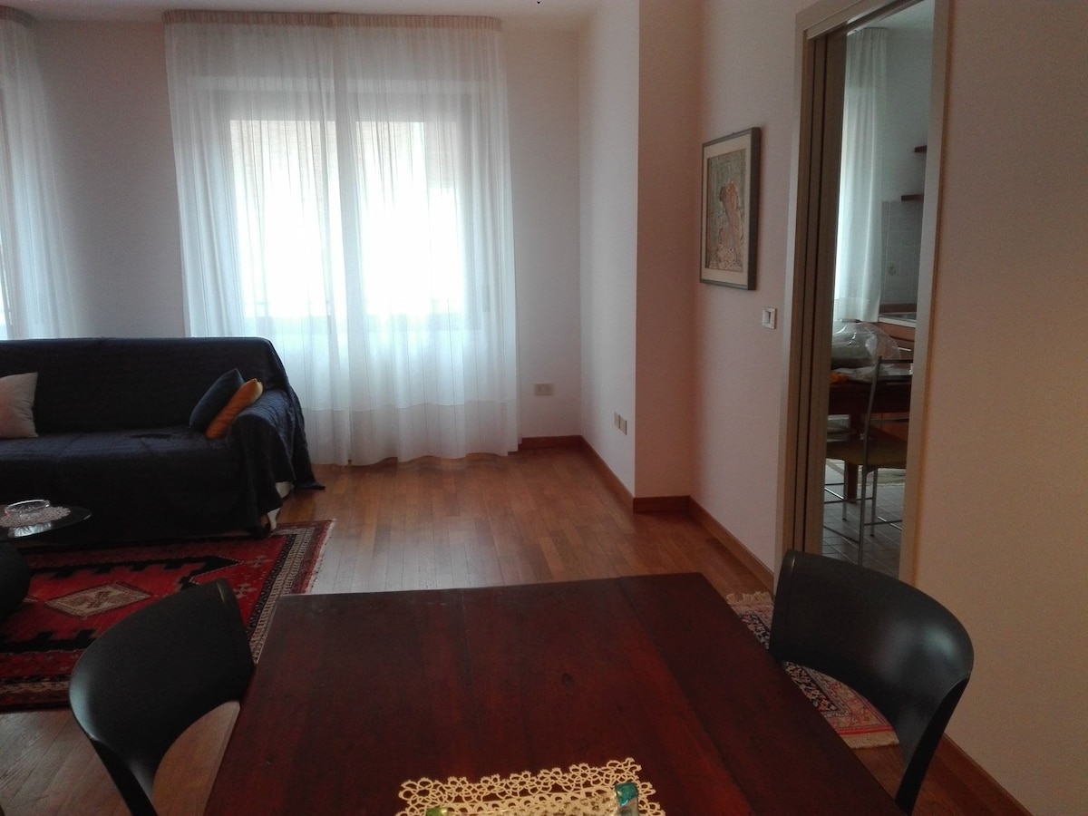 Precioso y acogedor apartamento a pocos pasos del centro del maravilloso Santarcangelo, a 400 metros con una pista peatonal arbolada a 6 minutos a pie. Además, la casa está a 200 metros de la estación de tren de Santarcangelo. Se puede llegar a la feria de Rímini en tren en tres minutos, o en coche en solo diez minutos. Desde el apartamento se pueden hacer varias visitas, como San Marino a 30 minutos, San Leo y Cesenatico a 25.