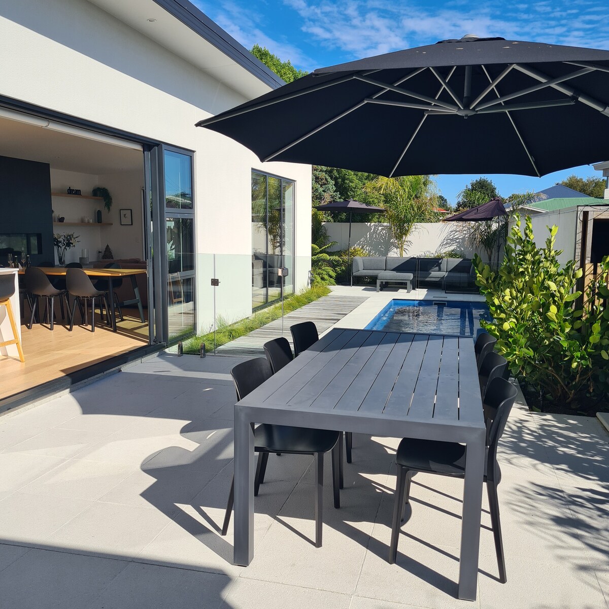 Charming, newly renovated 4 double-bedroom bungalow - 4 gorgeous double bedrooms, 2 stunning bathrooms in Blenheim's CBD - 2 minutes stroll to cafes, bars, supermarket, convention centre, shopping, stadium, and popular riverside walkways. Two beautiful large living spaces, multiple private outdoor dining/relaxing areas and decks, in-ground swimming pool with adjacent pool-house and BBQ area. This beautifully furnished home with high quality fittings and linens will provide a fantastic base.